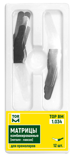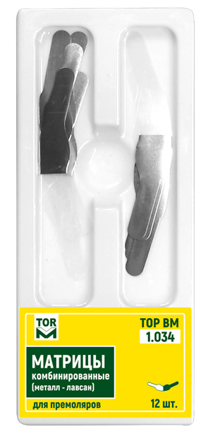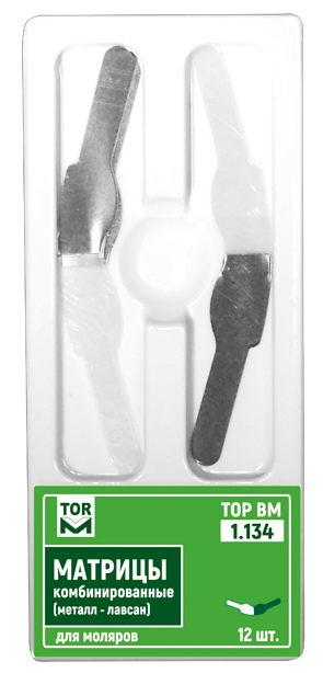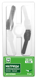 | Матрицы комбинированные "металл - лавсан" позволяют существенно облегчить процедуру введения матрицы в межзубный промежуток: сначала вводится металлическая часть матрицы, затем к месту дефекта протягивается прозрачная часть матрицы, после чего проводится реставрация. Матрицы выпускаются в наборах № 1.034 (для премоляров) и № 1.134 (для моляров). |