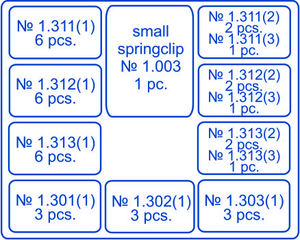Saddle Metal Matrices.18 pcs.:small № 1.311(1) - 6 pcs., medium № 1.312(1) - 6 pcs., large № 1.313(1) - 6 pcs., small springclip № 1.003 - 1 pc. Matrices are available of two thicknesses - 0,050 mm and 0,035 mm. Specify, please, the necessary type, e.g., 1.310 - 0,035 mm, otherwise you' ll receive matrices of the first type, i.e. 0,050 mm. |