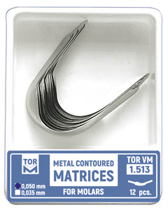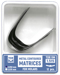 Metal Contoured Matrices for Premolars.shape 1 (without ledge)12 pcs. There are matrices of 2 thicknesses: