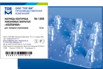 Выпускаются матрицы-«колпачки» для передних зубов № 1.910, для моляров и премоляров № 1.911, для детских зубов № 1.912 и № 1.913, матрицы-«колпачки» конические № 1.915 , а также ассорти матриц-«колпачков» на пластинах №№ 1.901, 1.903, 1.905, 1.907, 1.908, 1.909 .
