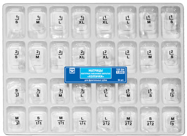 Матрицы-«колпачки» выпускаются в двух размерах – среднем (размер 2) и большом (размер 3). Каждая матрица (колпачок) имеет держатель, что делает работу с ней более удобной. На держателе указаны номер зуба и размер колпачка.