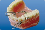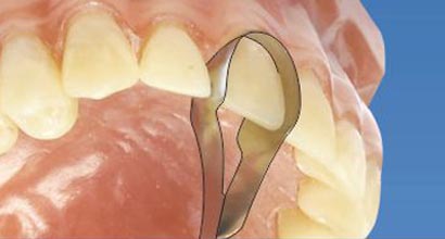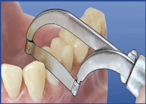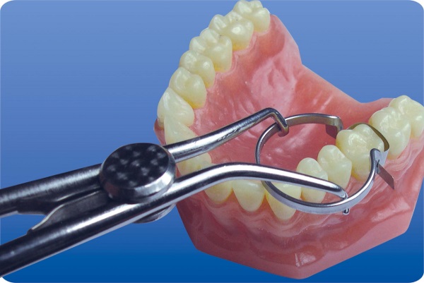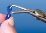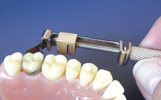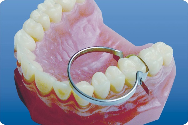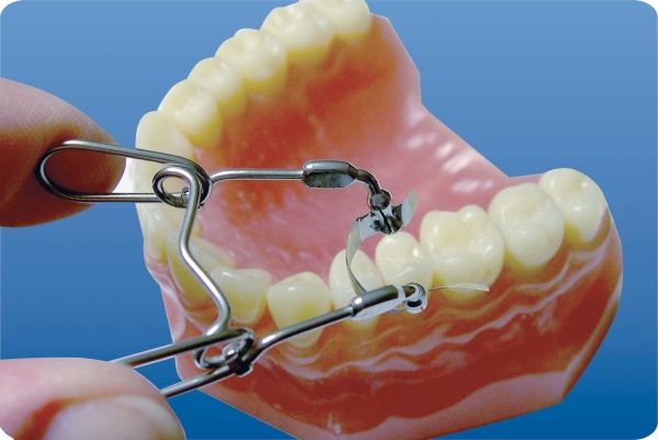 2. Растягивают фиксатор, разводя ножки щипцов, и устанавливают в межзубный промежуток.