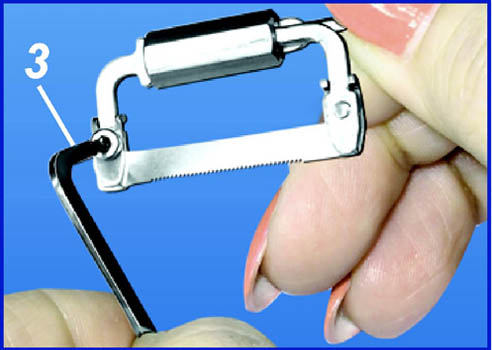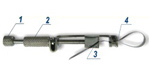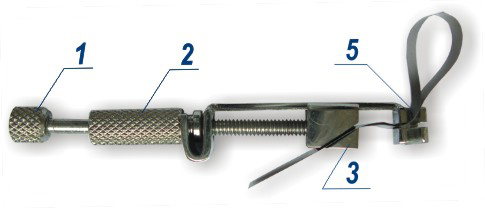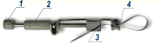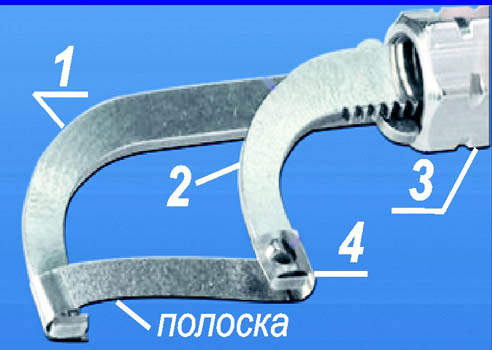 Вращая винт 1, натягивают полоску. Плотно вставляют штырь 4 держателя в ручку-держатель № 1.107 или одно из отверстий ручки-держателя № 1.109.