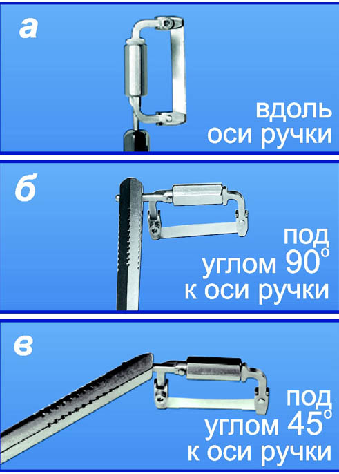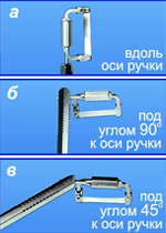 3 отверстия в ручке-держателе № 1.109 позволяют фиксировать штырь держателя в любом из трех положений: вдоль оси ручки, перпендикулярно (±90 градусов) и под углом ±45 градусов к оси ручки