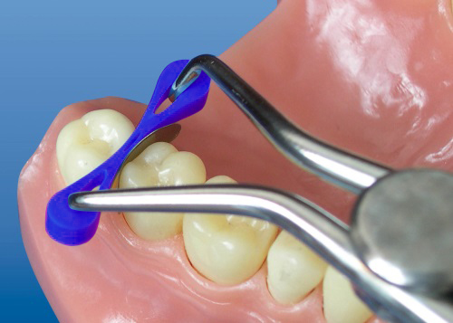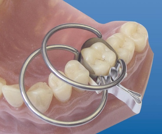 Установка 2-х колец с различной высотой ножек при реставрации 2-х контактных полостей зуба.