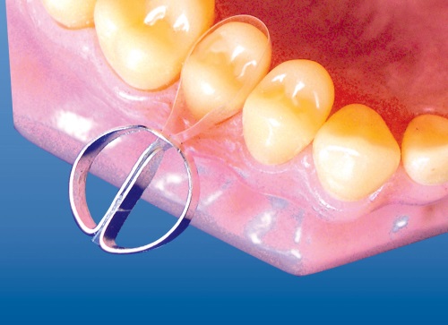 При работе необходимо следить, чтобы край матрицы, обращенный к десне, не выступал из щели кольца (фиксатора).
