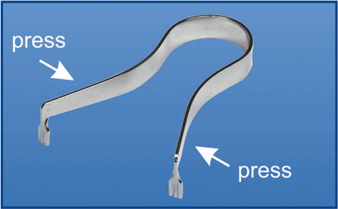 | 1. Outside the patient mouth install forceps tines into the holes of elastic wedge. | |
