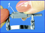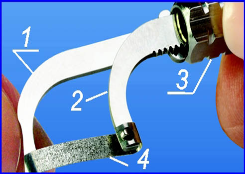 | Insert finger of leg 1 of the proxicut holder into the hole of saw blade (diamond strip) 4 and bend the blade (strip) 4 around leg 1 of the proxicut holder. | |