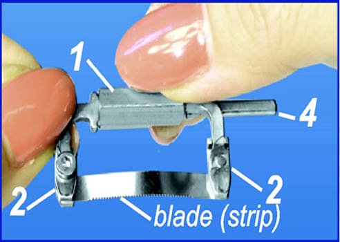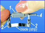 | Rotate screw handle 1 to tighten the blade (strip) between holder legs. | |