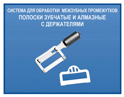 Система для обработки межзубных промежутков Полоски зубчатые и алмазные с держателями Система предназначена для удаления излишков пломбировочного материала из межзубных областей и разделения зубов при фиксации виниров.